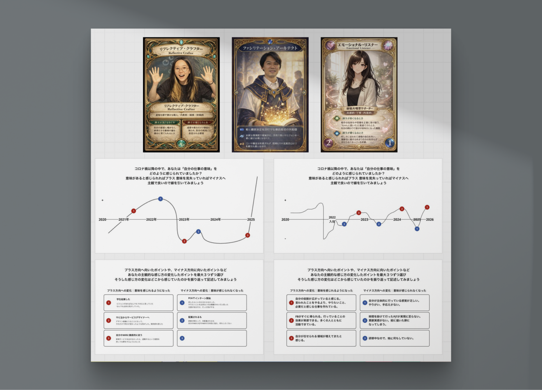 ワークショップでは、まず参加者が「自分の仕事の意味づけが深まった経験・希薄化した経験」を振り返った(サンプル:画像下)。その情報を元に、生成AIで「デザイナー像タイプ」「キャラクターカード」を出力し(サンプル:画像上)、お互いに共有し合った